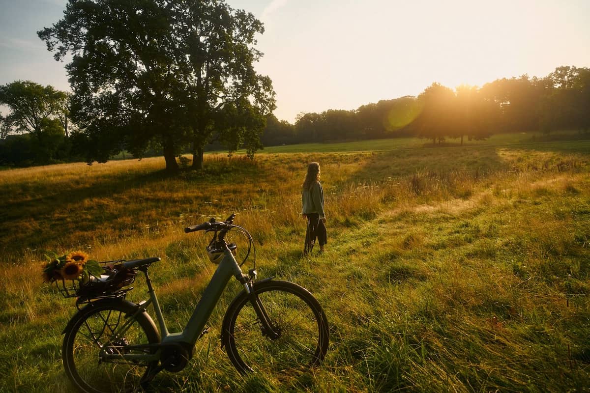 Kalkhoff Fahrrad mit Sonnenblumen im Korb in Sonnenuntergang Frau steht etwas weiter hinten auf Feld