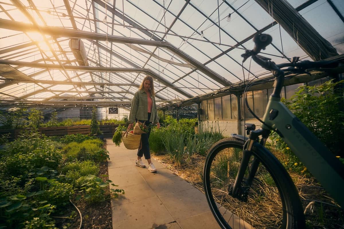 Kalkhoff Fahrrad im Vordergrund Frau im Gewächshaus mit Einkaufskorb